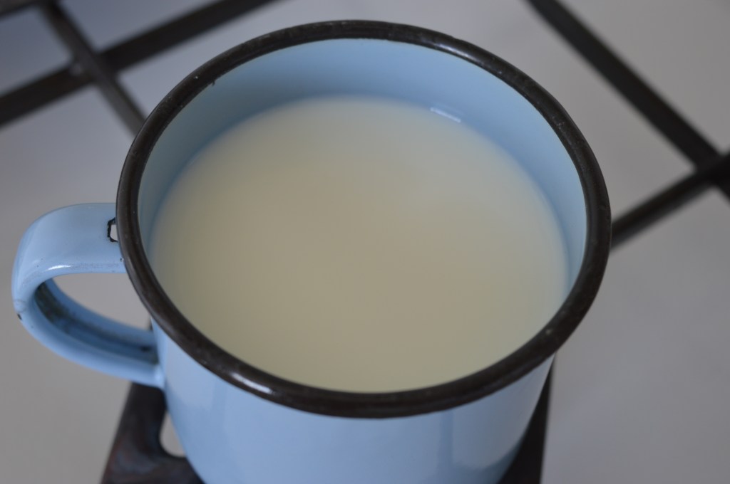 I pour the milk in a heatproof mug and warm it on a cooker over a low heat. Then I transfer a little of the warm milk into a small glass and crumble the yeast into it.