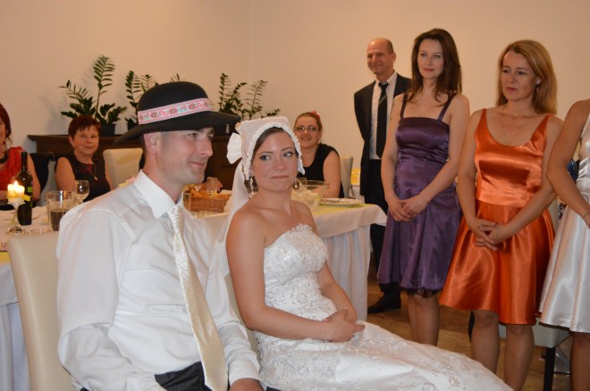 Before the bride and groom change into more informal clothes, a traditional little farce is staged before the guests, in which the bride passes her bridal veil onto another young unmarried lady. Both the groom and the bride are then crowned with ceremonial hats symbolising their admission to the married club.