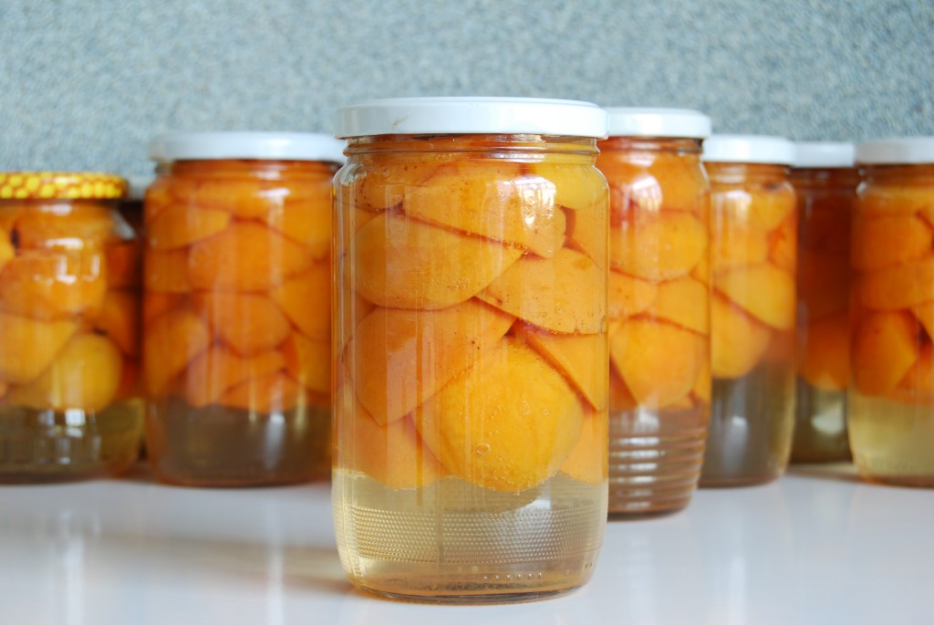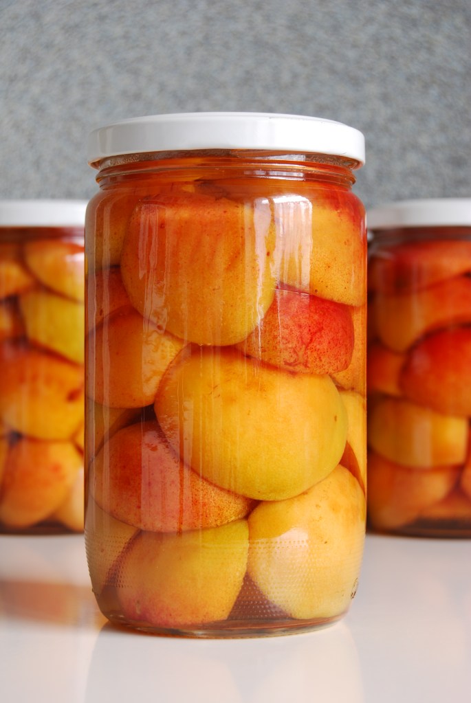3. Cram the apricot halves into the clean jars up to their grooves. Ladle in as much warm syrup as to cover all the fruit. Screw on the lids and place the jars on a baking sheet, spacing them 5 – 7 cm apart. Put in the oven and sterilize at 85ºC for 20 minutes.
